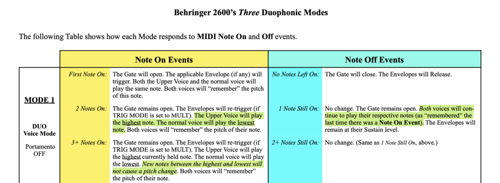 This is a short, 3 page supplemental document for the 24x7 YouTube video Behringer 2600 Up Close: The Three Duophonic Modes. It provides a condensed summary of the content contained in the video (plus a few things the video didn't cover). Think of it as a Quick Reference for what the video teaches. Understanding the differences between the Modes, especially 2 and 3, will help you choose the right one for the sound/effect you're after.