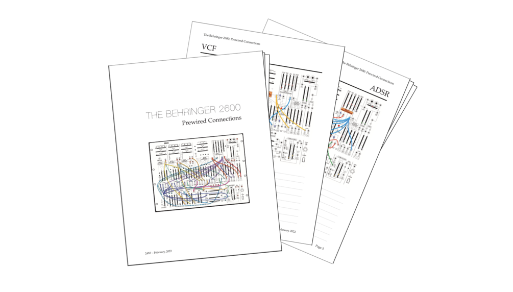 This beautifully illustrated document exposes the prewired, normal connections between modules on the Behringer 2600. It proceeds module by module, from left to right, across the top (VCO 1 to MIXER) and then across the bottom (KYBD to SAMPLE & HOLD). For each of those 15 modules, it shows you the incoming and outgoing prewired connections, each color coded by signal type.